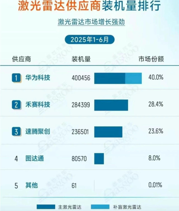 而近日,我们发现华为真没有吹牛,数据显示,2025年1-6月份,国内激光雷达市场,华为已经拿下了40%的份额,排在国内第一名了。